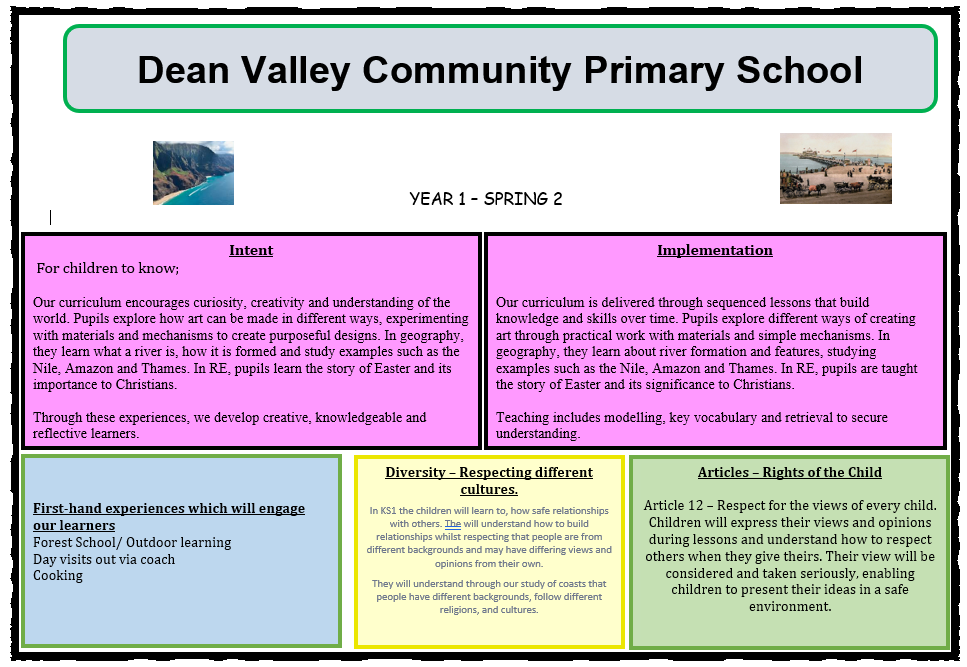 Our curriculum is delivered through sequenced lessons that build knowledge and skills over time. Pupils explore different ways of creating art through practical work with materials and simple mechanisms. In geography, they learn about river formation and features, studying examples such as the Nile, Amazon and Thames. In RE, pupils are taught the story of Easter and its significance to Christians.Teaching includes modelling, key vocabulary and retrieval to secure understanding.